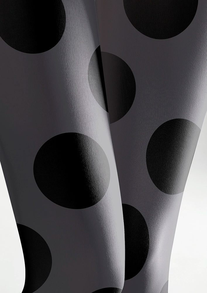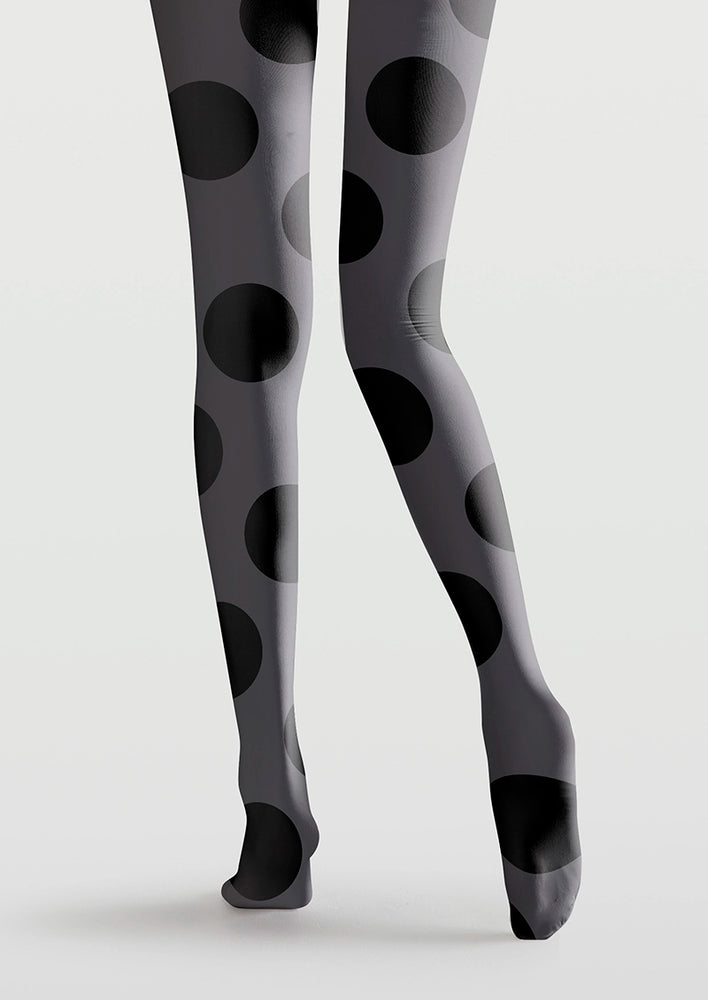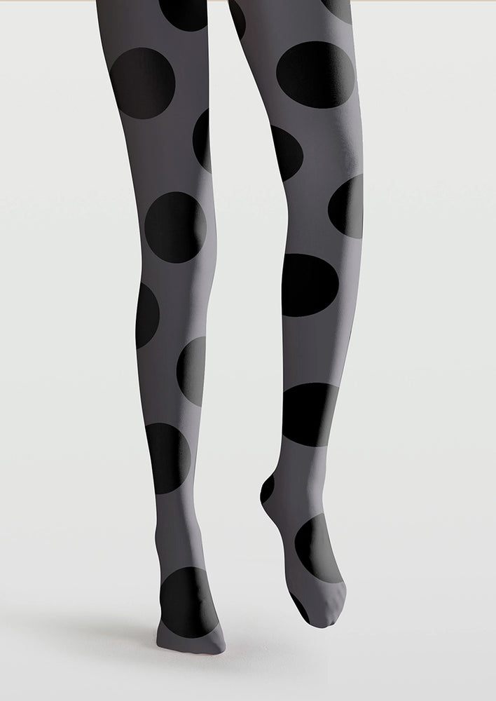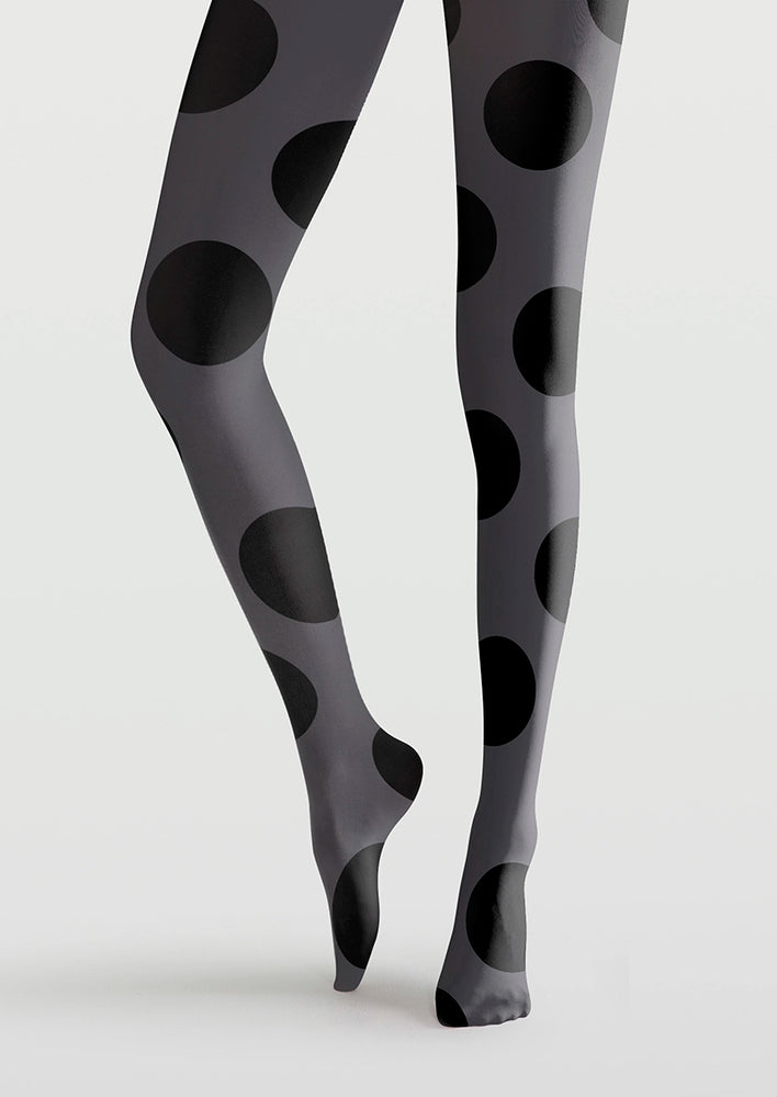 Make a modern statement with these bold tights. A high-contrast pattern of light grey polka dots on a solid black base creates a graphic, industrial chic look.