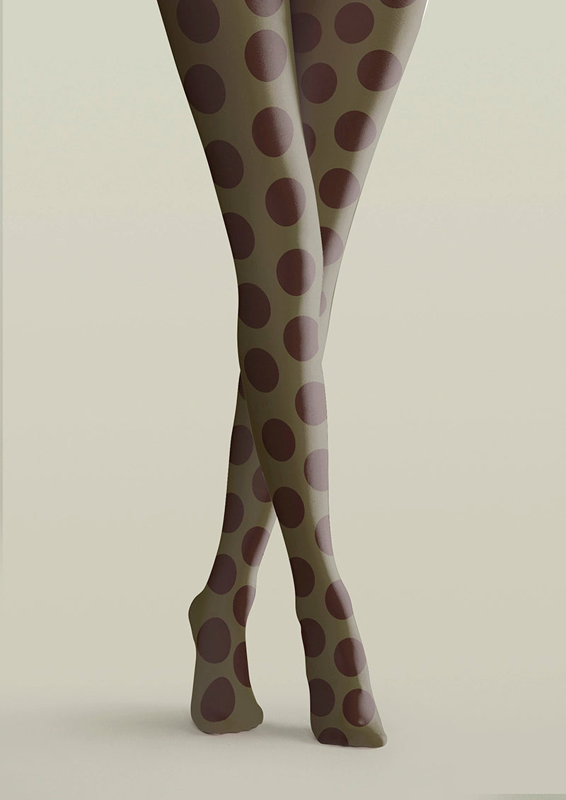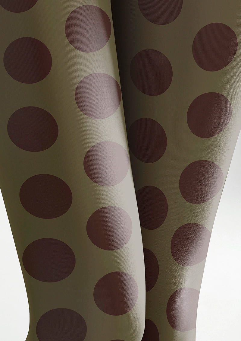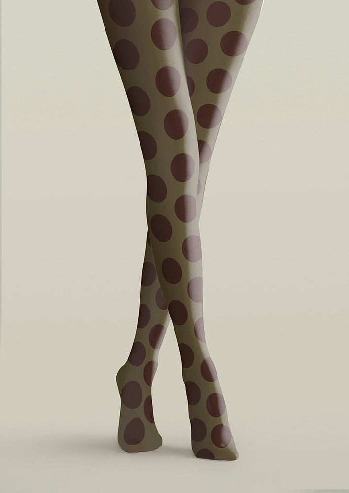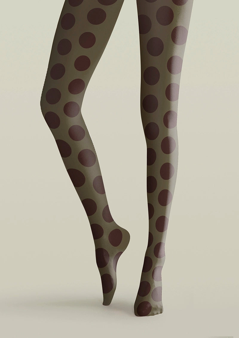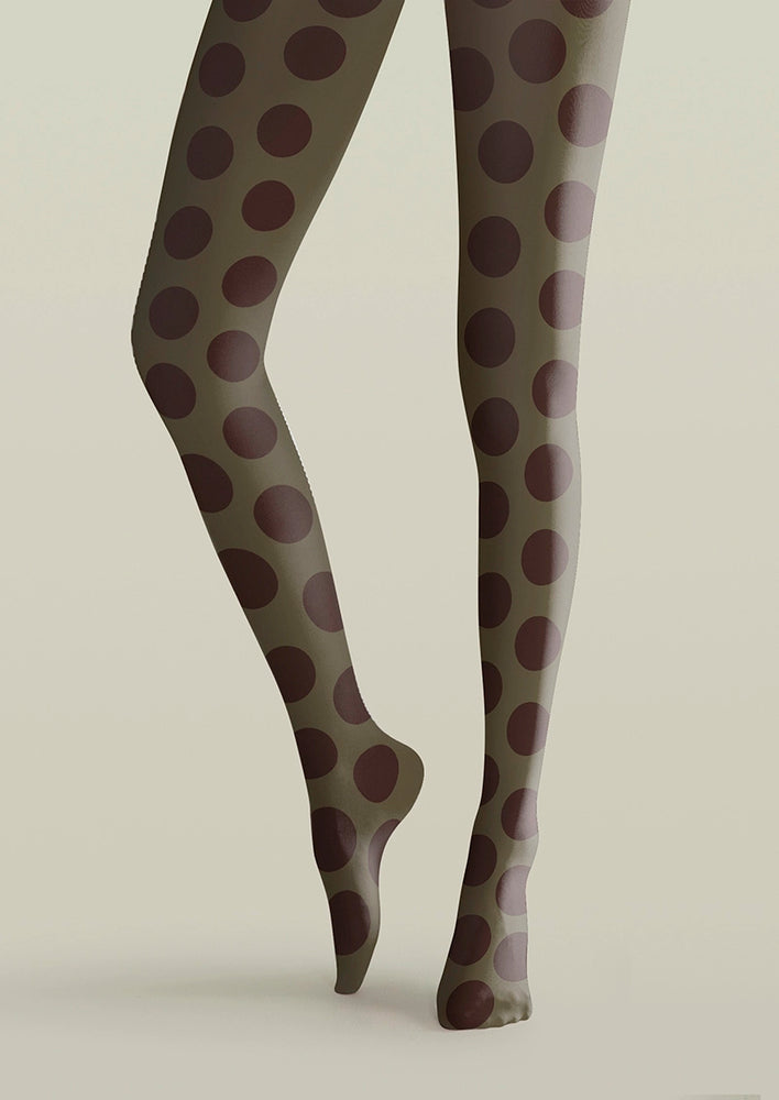 These tights feature a harmonious blend of olive green and chocolate brown. A scatter of deep brown polka dots on an olive base creates an organic, grounded, and subtly stylish look.