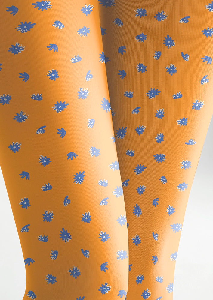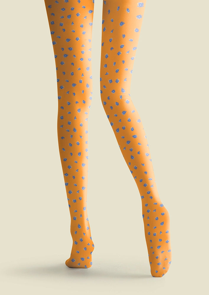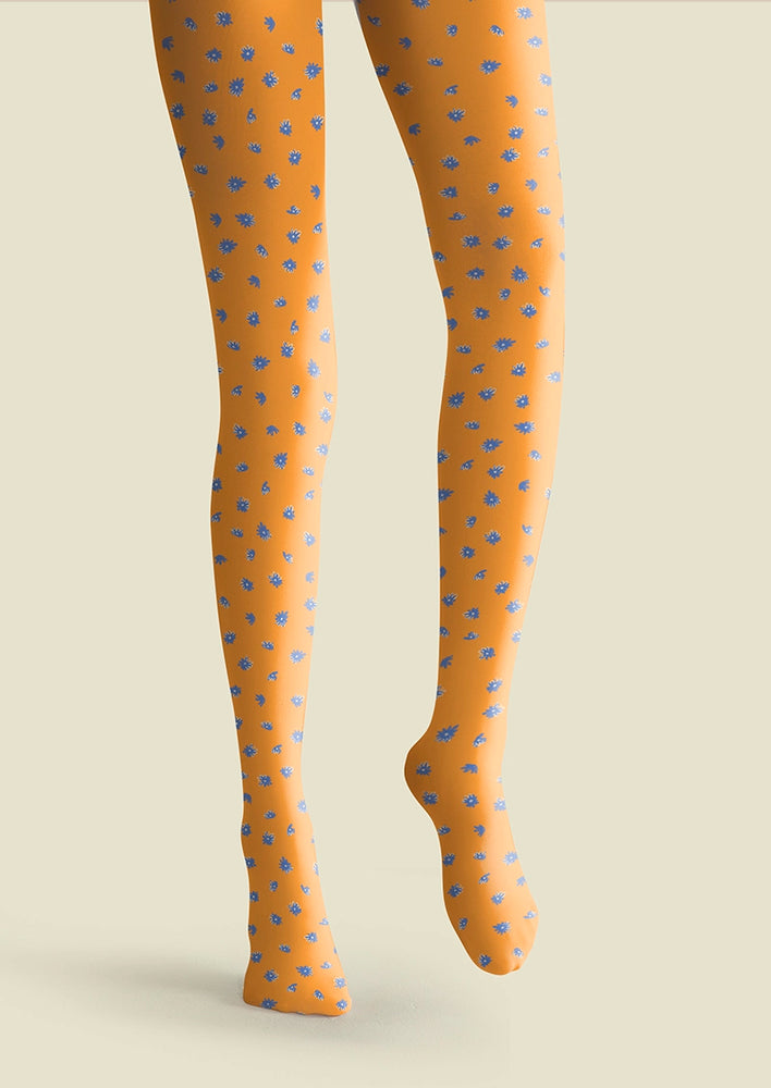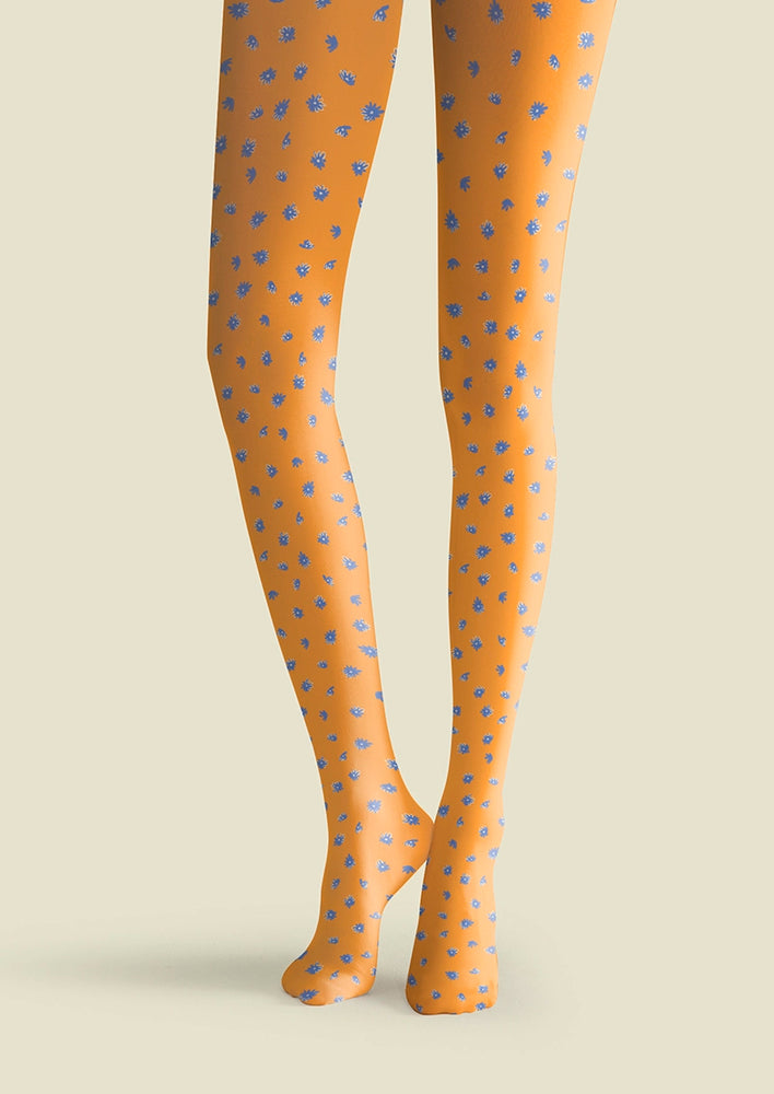 Yellow tights with a delicate cornflower blue floral print. A vibrant, cheerful, and fresh legwear statement.