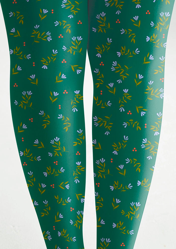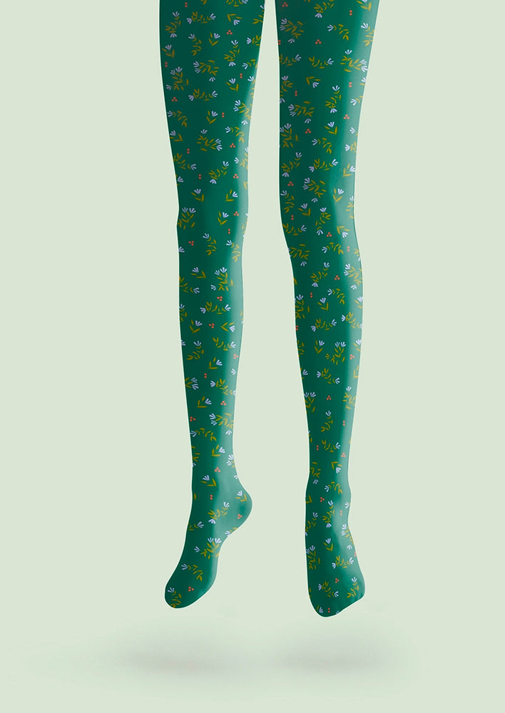 Step into an enchanted garden. These tights feature a delicate scatter of colorful blooms on a fresh green background, offering a simple and whimsical touch to any outfit.