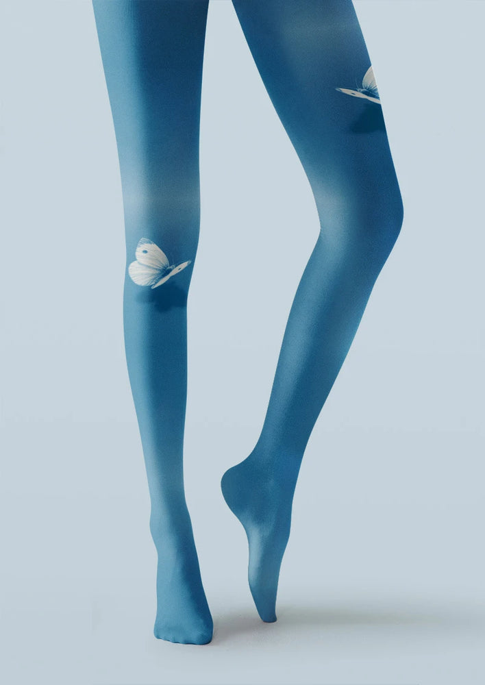 Blue sheer tights with floating butterflies bring a dreamy, artsy vibe to any outfit.