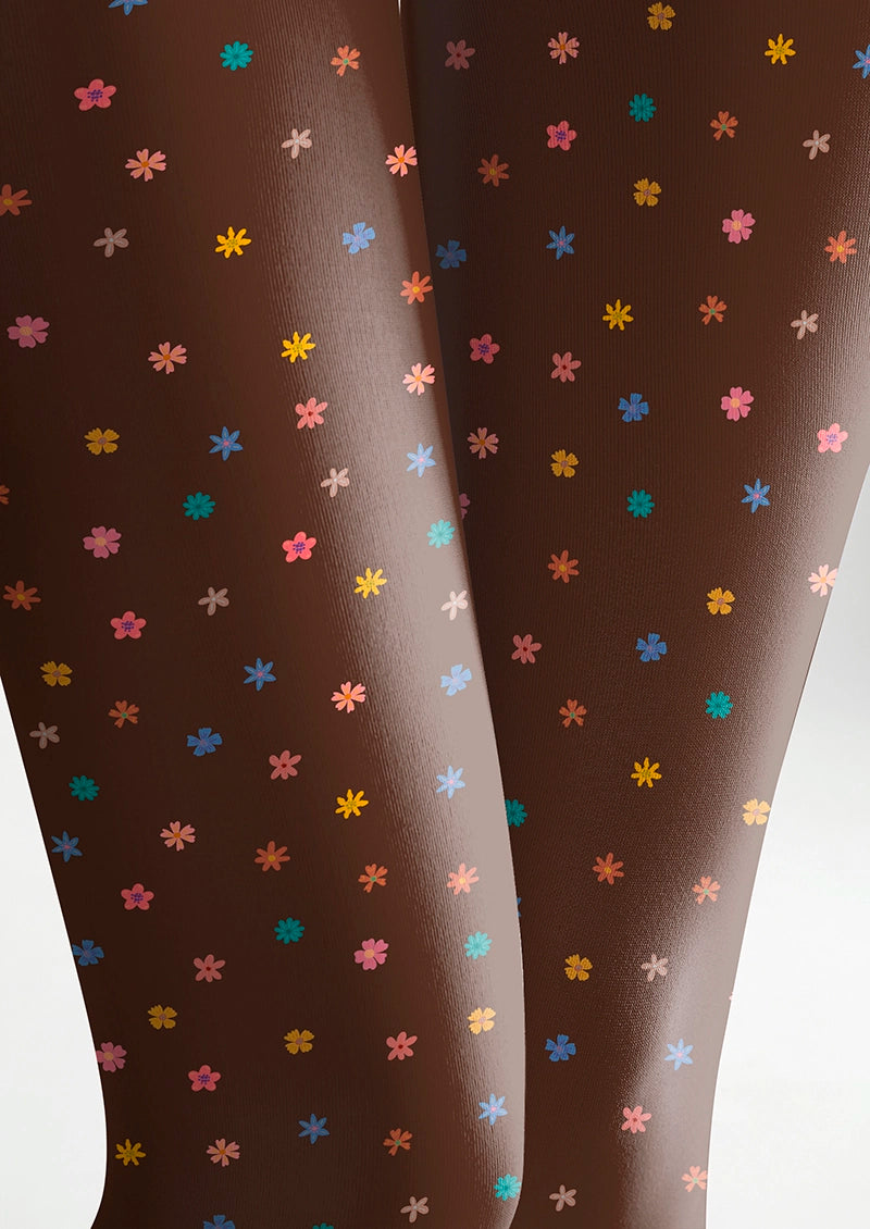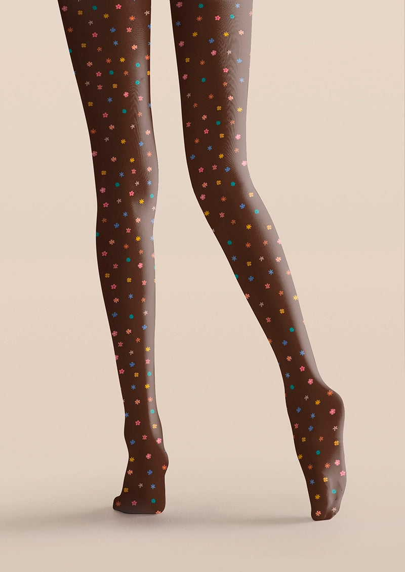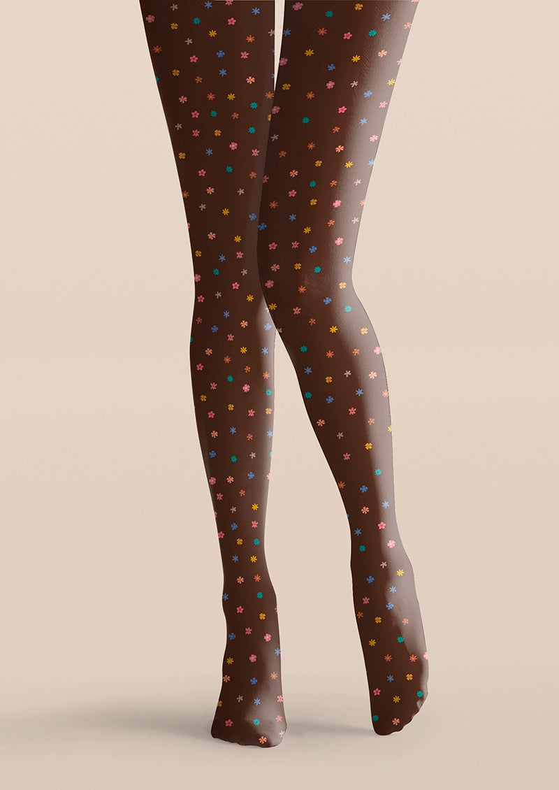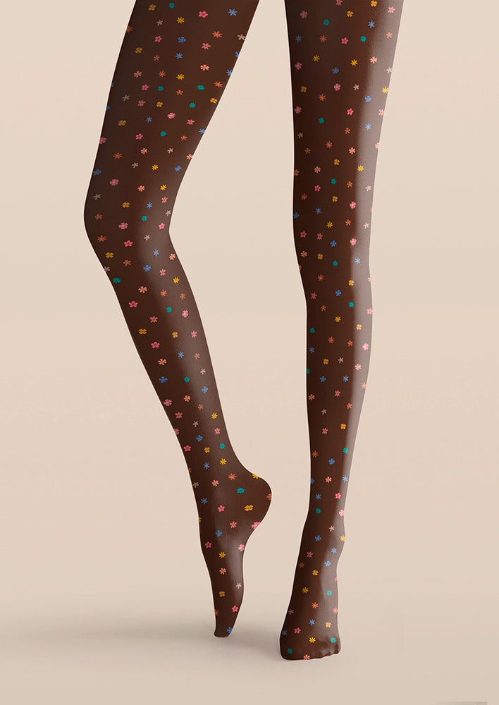 Brown tights with a colorful, small floral print. A delicate, vintage-inspired, and versatile legwear essential.