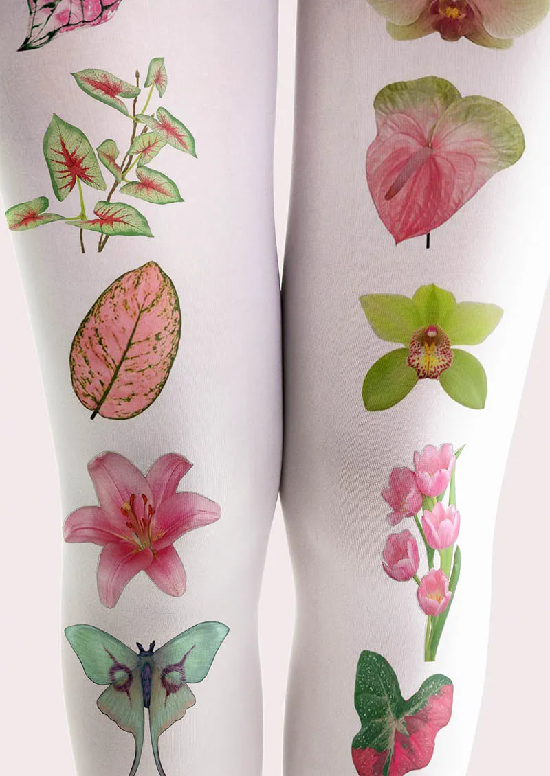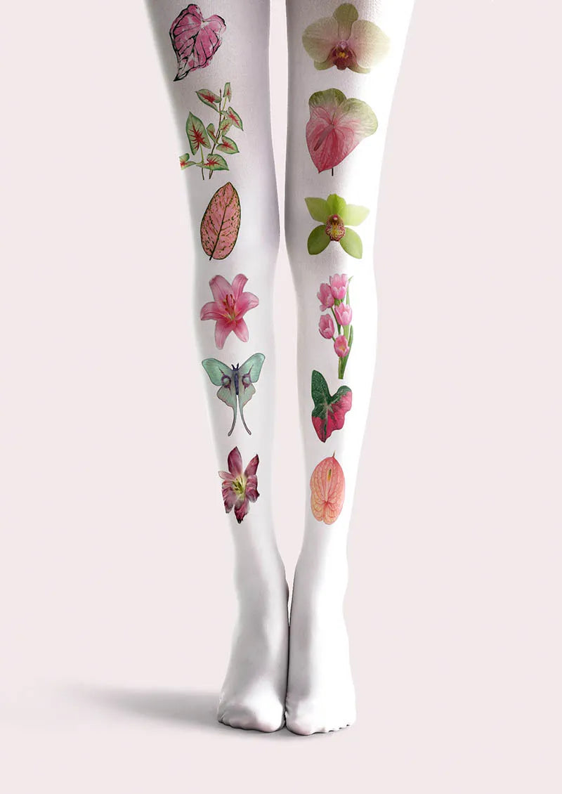 Viken Plan White Botanical Collage Y2K Style Tights Hosiery Pantyhose