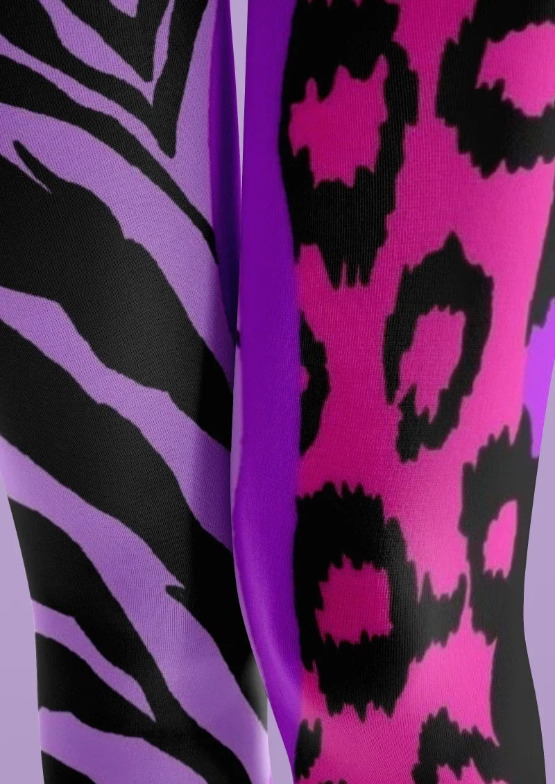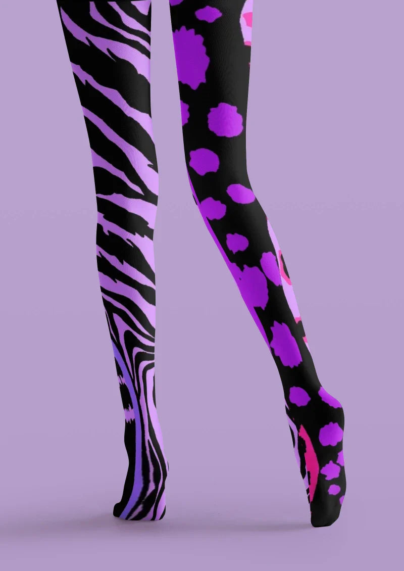 Regular price $39.90Bold purple & pink animal print tights with zebra and leopard details. Artsy & cyberpunk, perfect for festive and night out occasions.
