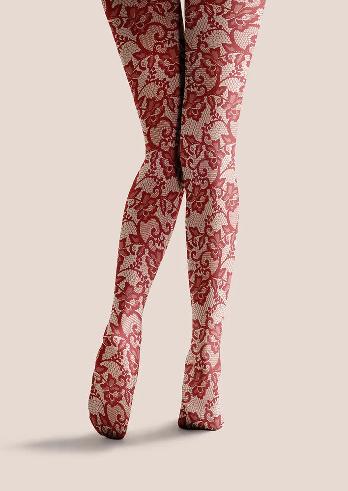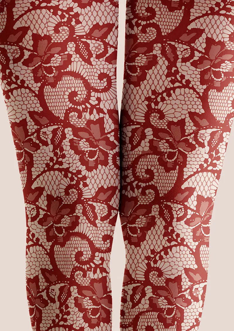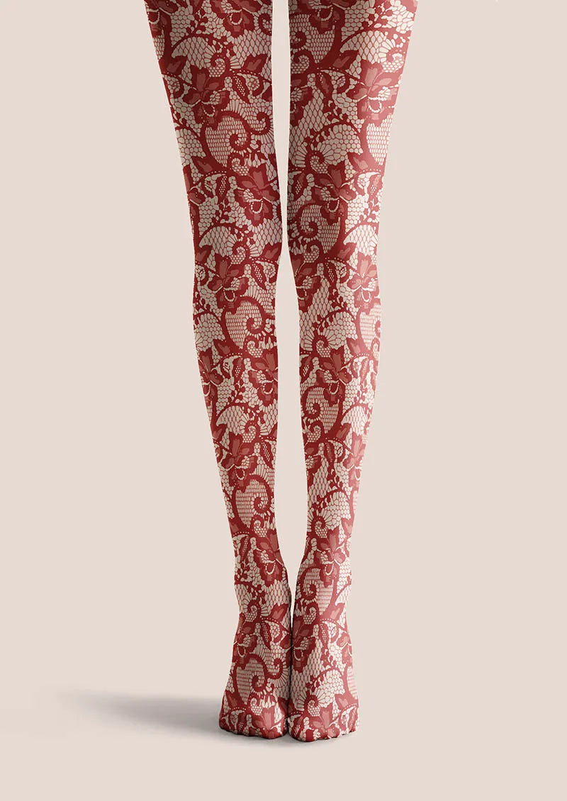 The Scarlet Bloom Lace Print tights blend soft comfort with intricate lace artistry. Rich scarlet floral patterns create a striking, elegant statement, perfect for evening wear or festive occasions.